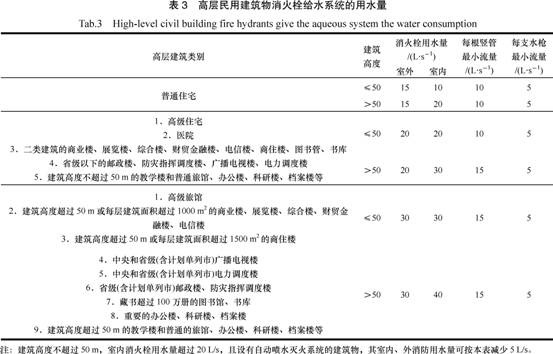 高層建筑的消防用水總量應按室內(nèi)、外消防用水量之和計算。如果高層建筑內(nèi)設有消火栓、自動噴淋、水幕、泡沫等滅火系統(tǒng)時,其室內(nèi)消防用水量應按需要同時開啟的滅火系統(tǒng)用水量之和計算。高層民用建筑室內(nèi)、外消火栓給水系統(tǒng)的用水量,不應小于表3的規(guī)定。